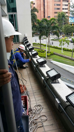 For the Christmas season, three imposing buildings are illuminated, symbol of Colombia's largest financial transactions. The project was conceived as decorative lighting and finally remains permanently. The client can change the color of the facade from a web page or from a mobile phone. Wireless DMX was used to communicate the three towers.
